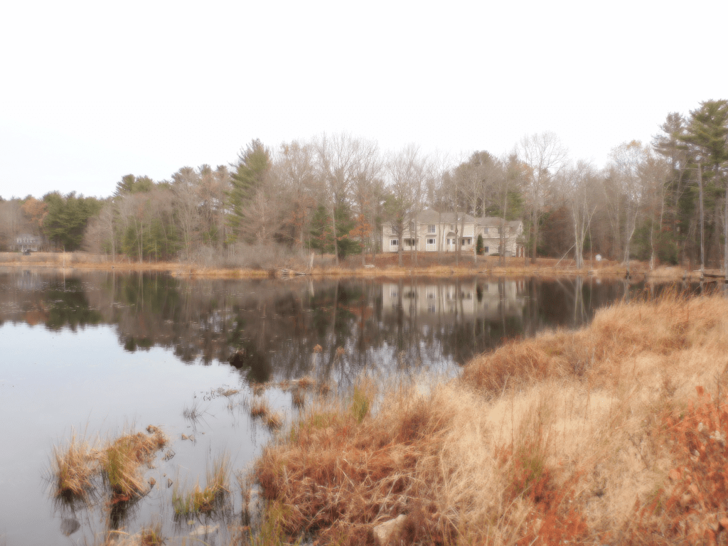 A side note is that the pond is fed by Nilus Brook. The brook continues from the drain from the ice pond to Old Mile pond which contains the grist mill. The water then flows under High street. The brook then goes to The Meadow pond which flows into Hampton Marsh.