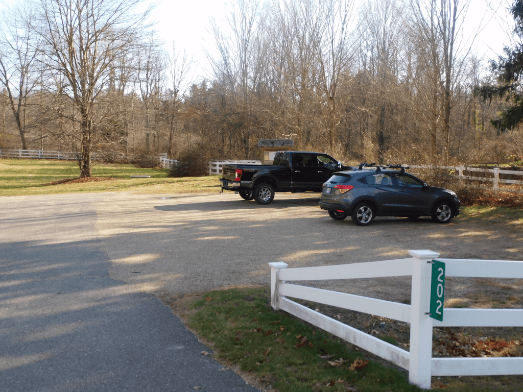As one heads from Portsmouth to Exeter on Route 33, one passes by Stratham Hill park. About a mile past that, there is a small field with white fences. If one stops and enter the parking lot, you will see a sign that says Stratham trails. It place is easy to go past it without even seeing the parking lot.